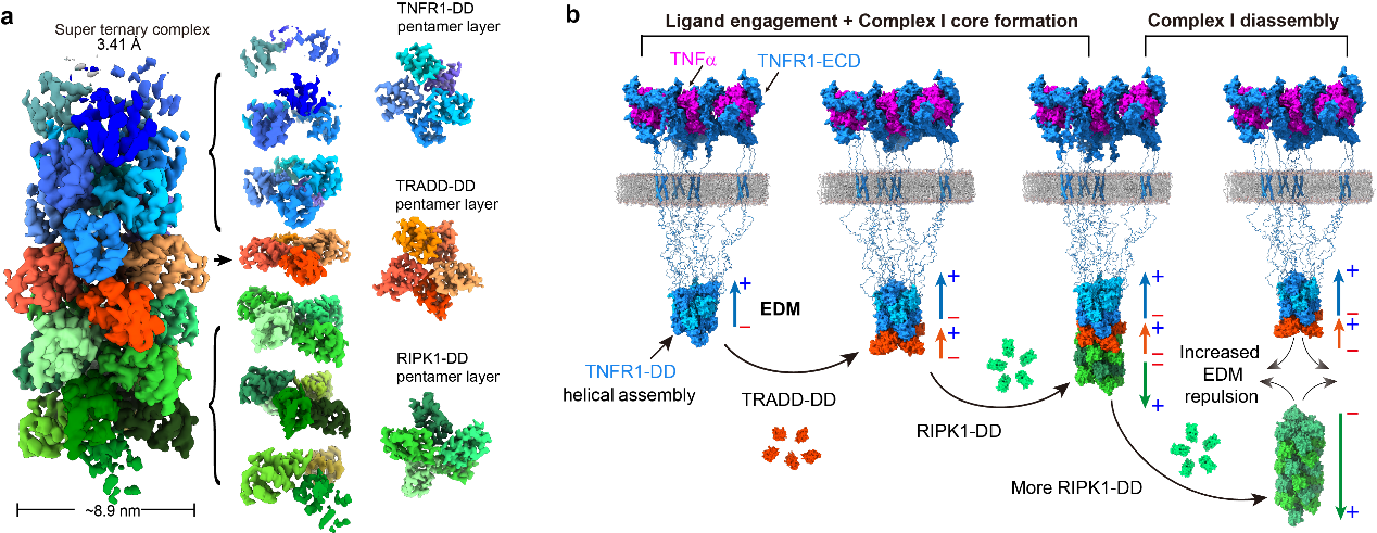 Figure 1. Mechanism for the dynamic assembly and disassembly of TNFR1 signaling Complex-I. (a) A helical super-complex consists of death domains of TNFR1, TRADD and RIPK1. (b) The force between electric dipole moments drives the dynamics of Complex-I. (Image by Jianping LIU) In the study published on Nature with the title “Electric dipole moment drives the dynamics of TNFR1 mediated Complex I signalosome”, scientists from IRCBC captured the core of Complex-I which consists of TNFR1, TRADD and RIPK1. The high-resolution structure determined by cryo-EM technology reveals the structural feature of a helical super-complex assembled by 31 copies of death domains (DDs): a layer of TRADD-DD pentamer is sandwiched between two layers of TNFR1-DD and two layers of RIPK1-DD pentamers. The authors found that the unique mode of assembly is determined by the specific interaction between three types of DDs through contacting surfaces with highly complementary electrostatics. They also noted that the highly polarized distribution of charge on the surfaces of these DDs results in strong electric dipole moment (EDM) in this helical super-complex. Most intriguing is that the direction of EDM of RIPK1 layers is opposed to that of TNFR1 and TRADD layers. In physics, opposing EDMs can cause long-range repulsion between molecules without physical contact. Thus, the scientist proposed that the long-range EDM interaction between RIPK1-DD and TNFR1-DD/TRADD-DD would destabilize DD super-complex and drive the dynamics of Complex-I. With a series of carefully designed mutants of RIPK1 that only change the EDM without affecting DD interacting surface, they proved that increasing the EDM of RIPK1-DD indeed shorten the life-time of RIPK1 in Complex-I, reduce the signaling strength of NF-kB pathway, and vice versa. This work beautifully revealed that EDM interaction between proteins drives the dynamics and function of an important signaling complex, and first time experimentally demonstrated the unprecedented functional role of long-range EDM interaction in cell signaling.